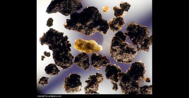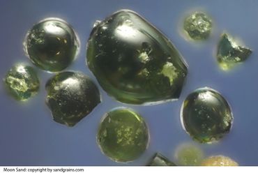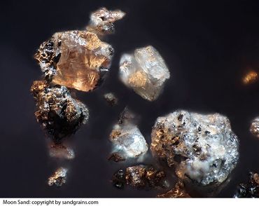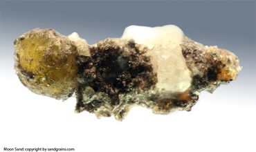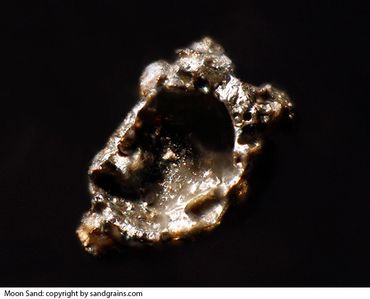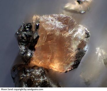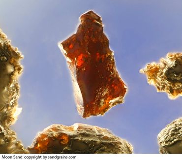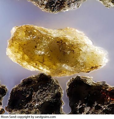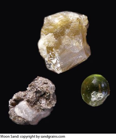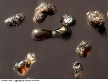 The moon has no atmosphere and no water. That means that rocks don’t erode in the same way as they do on earth. Instead, the moon is continually being bombarded by meteorites and micro meteorites, some the size of a small bit of dust, but travelling at tens of thousands of miles per hour. With no atmosphere to stop them, they hit the moon and instantly vaporize the underlying rock. Over the years, the moon has become covered in a fine powder or dust, the result of the continual micro impacts. Some of the sand and dust looks like dark, basaltic lava. Other grains are clearly crystallized minerals of different sorts. Some are tiny sphere-like objects that are formed when a tiny bit of rock vaporizes and cools into a microscopic glassy sphere. The most unique grains are called agglutinates, which are formed when tiny molten droplets bind together pre-existing grains of sand.